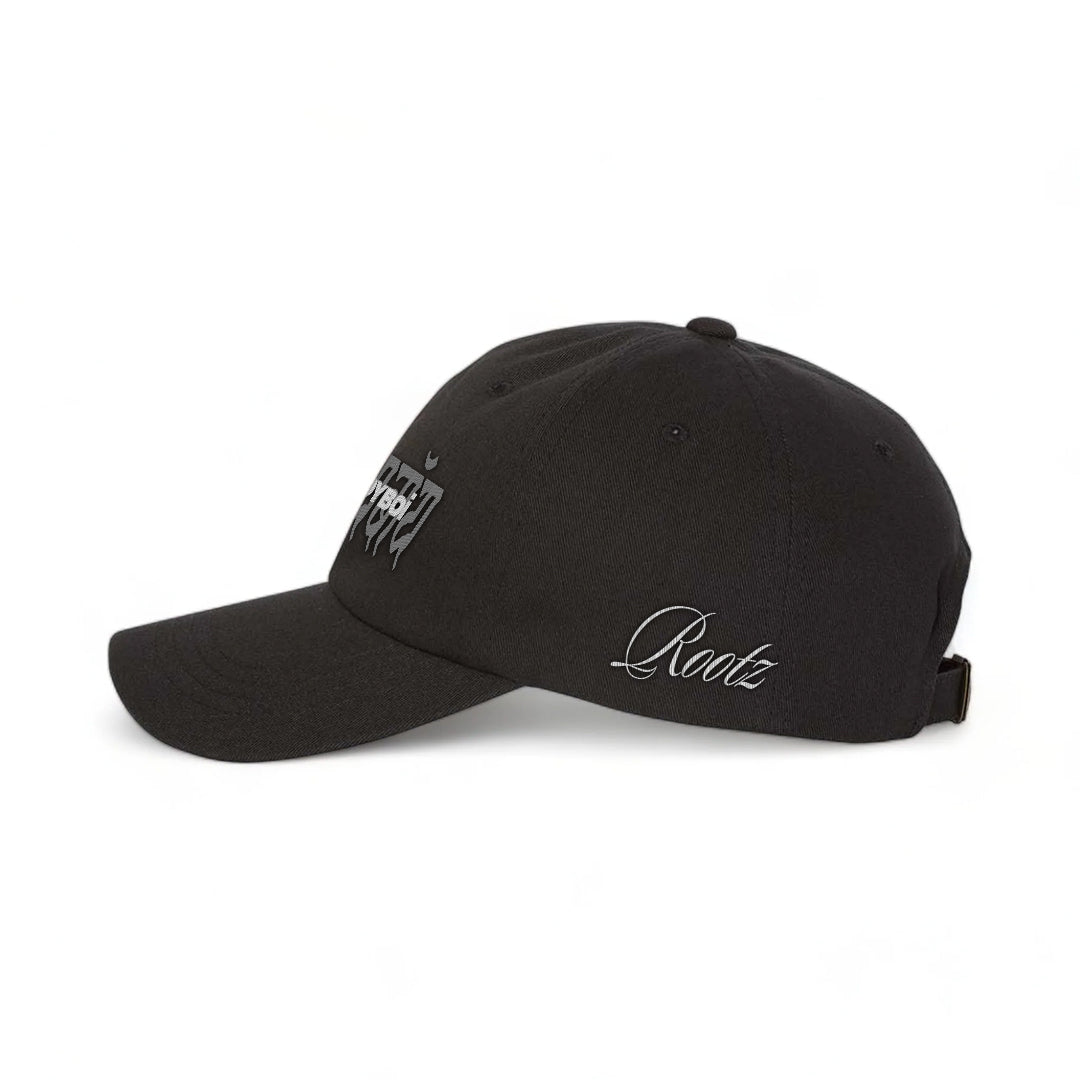 Black dad hat with front and left-side design to celebrate the release of TroyBoi's "Rootz EP"